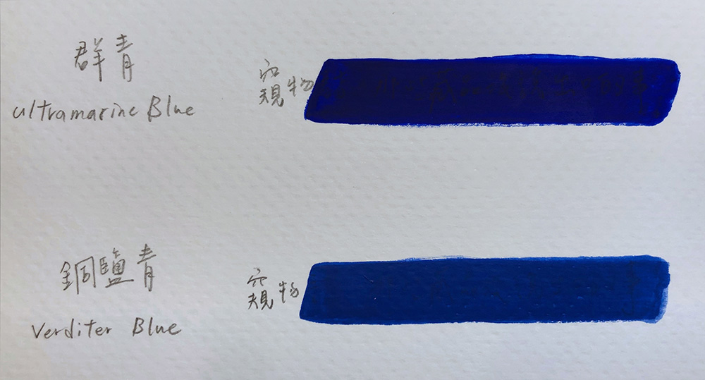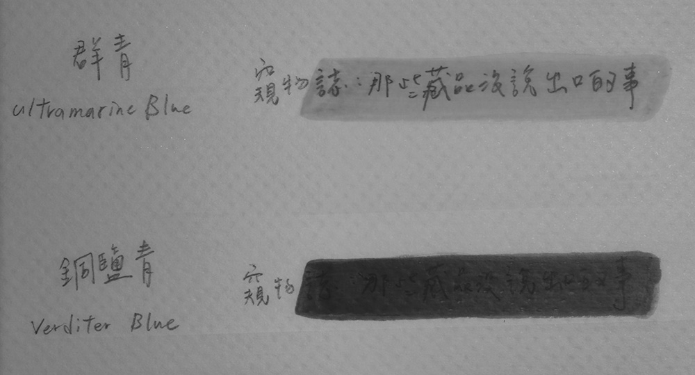 上圖是用兩種不同的藍色顏料覆蓋在鉛筆字跡上,可見光底下鉛筆字跡被遮蓋,紅外線反射影像則讓群青顏料下的字跡清楚可辨。