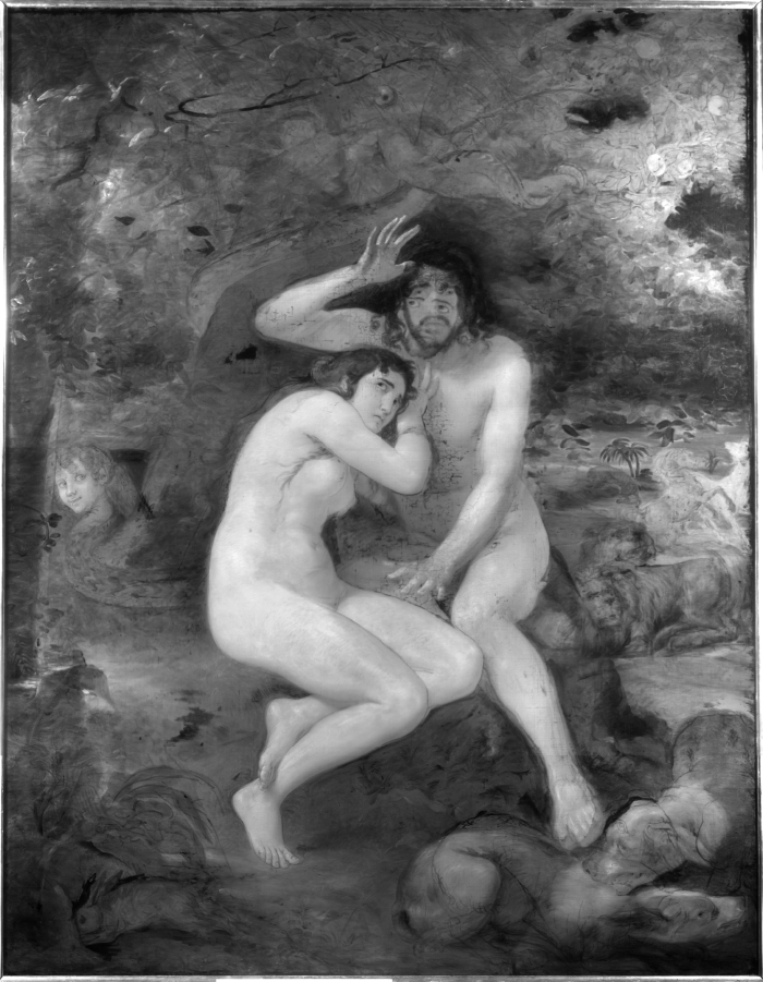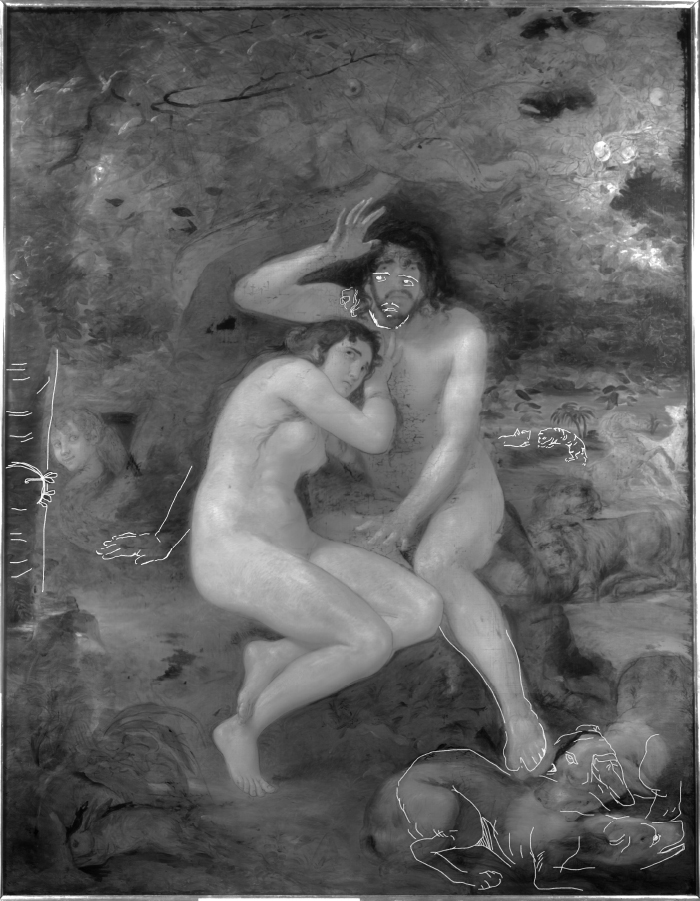 畫面左側的樹木我們也可看到畫家索尼變動的痕跡。從紅外線攝影的照片來看,左側原本有一個樹幹延伸到下方的草堆,但我們從現在的〈亞當與夏娃〉畫面卻看不見這個樹幹了,只有看到人面蛇身撒旦後面有一個樹幹了。