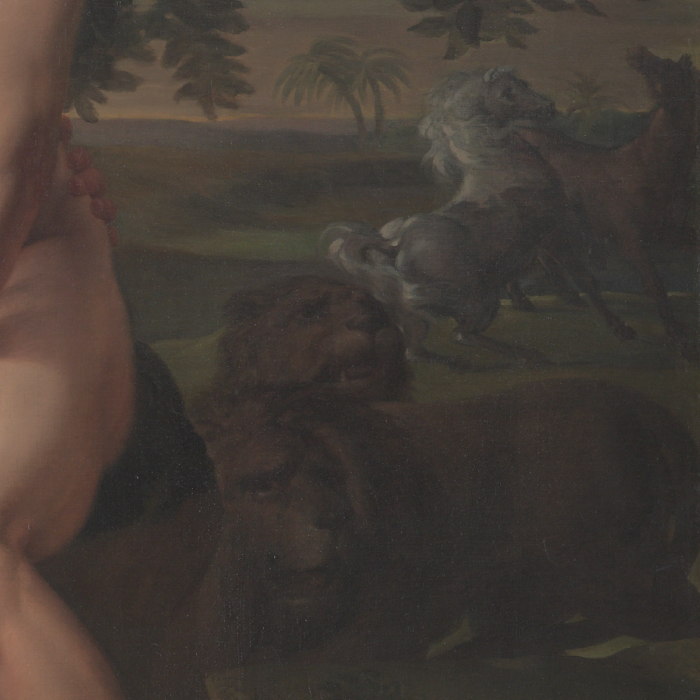 我們再仔細看看右邊背景的部分,除了現在可見的成對白馬、獅子和狗以外,其實原本畫家還畫了一對老虎呢!!!其中一隻老虎正向著左側,似乎想跳上眼前的小山坡。從紅外線的影像中,我們可以看到畫家已經為這隻老虎上色,還畫上了條紋,算是完成度很高。但對面的另一隻老虎則僅描繪了輪廓,尚未上色,可見畫家在上色之前便已改變心意不要畫出這對老虎,而改成我們現在看到的風景。