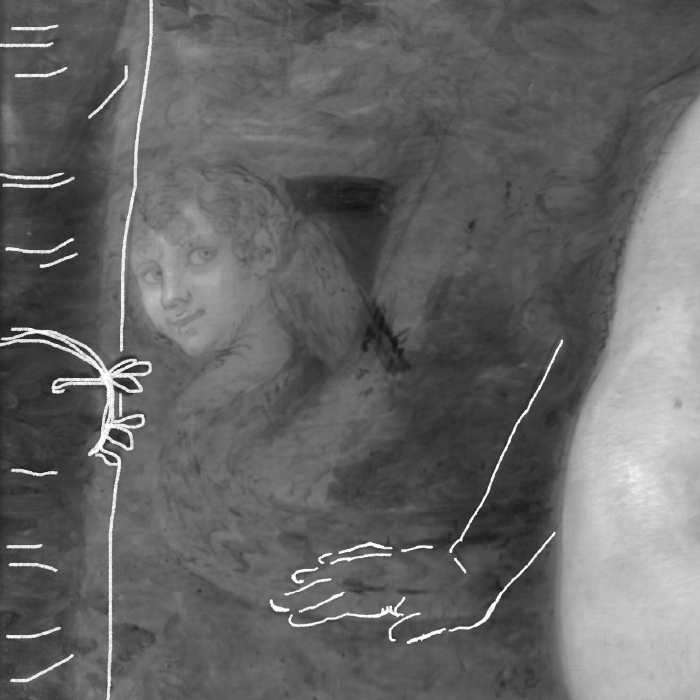 紅外線反射影像細部。白色線稿的部分是我們現在從彩圖上中看不到、畫家過去修改的痕跡。