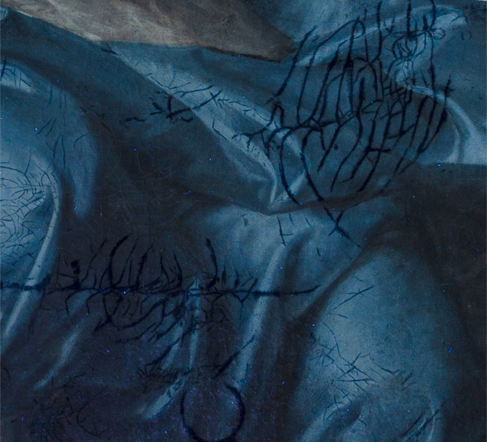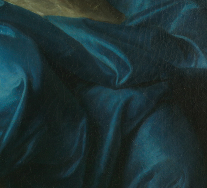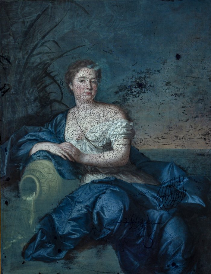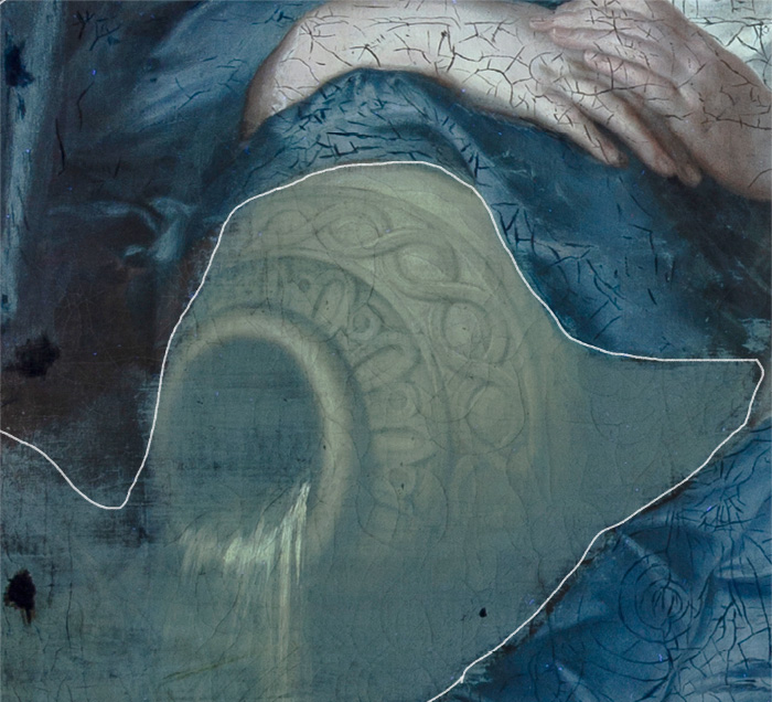 女子的面部、身軀和手臂在正常觀賞時有著光潔無瑕的肌膚,但在紫外線照射下卻遍佈許多網狀的深色線條,這些就是後人補色修飾的地方。由於作品的繪畫層有許多龜裂紋,這些補色處理便是為了想修飾這些裂紋所導致的視覺干擾,不過補色的材料與油畫顏料不同,因此在紫外線下便呈現不同的螢光反應,原形畢露。除此之外,藍色罩衫上也可看見不同型態的裂紋修飾痕跡。