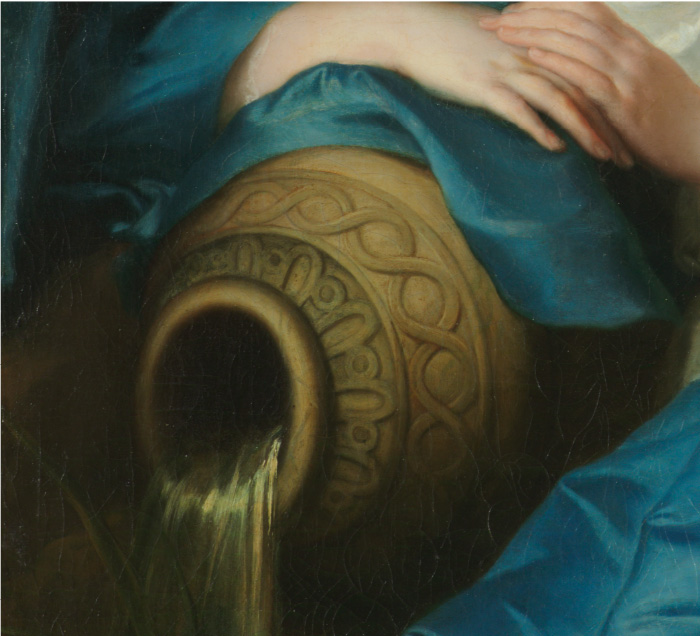 畫中的女子倚靠在不斷湧出泉水的甕瓶上,一身白色的希臘羅馬式的白色衣裙搭配上湛藍色的緞面罩衫,既有女神般的莊重優雅,又顯得雍容華貴。納提葉的畫功精緻細膩,不論女子的肌膚或衣服的質感,都描寫得相當精細與逼真。尤其在略帶黃昏景色的襯托之下,女子白皙無瑕的肌膚和亮麗的湛藍罩衫更是閃閃發光。