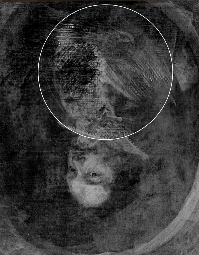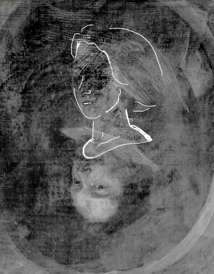 除此之外,還可以隱約看到馬瑟萊爾肖像的下方有個人物頭像和衣領,並且剛好與上方的馬瑟萊爾彼此方向顛倒,不過下方人物的顏料層較薄,所以較不清晰。
