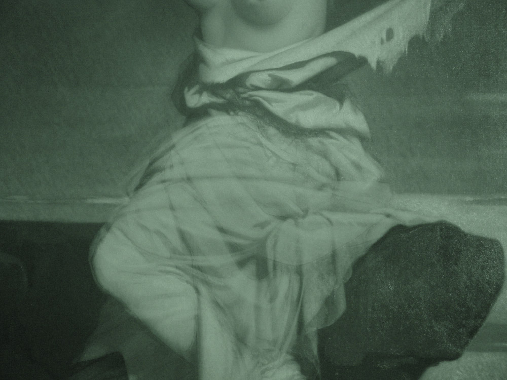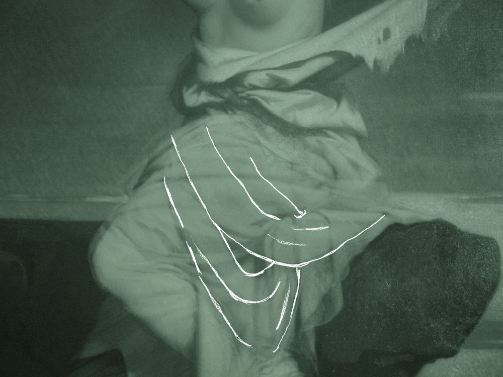 當觀察這部分的修改時,或許我們會想為什麼畫家要特別修改衣褶線條呢?讓我們從整體畫面設計來思考可能性吧!原本左上右下的弧形皺褶線條,過於圓潤流轉,其實與畫中想要傳達的強烈悲痛氣氛有點不搭。再來,拉結撕扯衣連身裙的上半部,並將之向後用力拉扯,若是此時下半身的衣裙皺摺是自然垂落的弧形線條,那看似也有點不合理。除此以外,原本的弧形皺摺線條也與拉結拉扯的白衣線條多次重複,使得畫面線條顯得有點單調!由此可見,畫家修改衣裙皺摺的決定,其實是對整個畫面設計和氛圍全盤推敲後所作的決策!