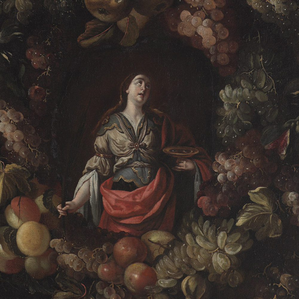 這件作品結合宗教人物畫與花果靜物畫的特別類型,透過花卉水果製成的環串來框圈出中心的基督教人物,所刻畫的花卉與水果也多含有基督教象徵意義,豐富畫面內容。