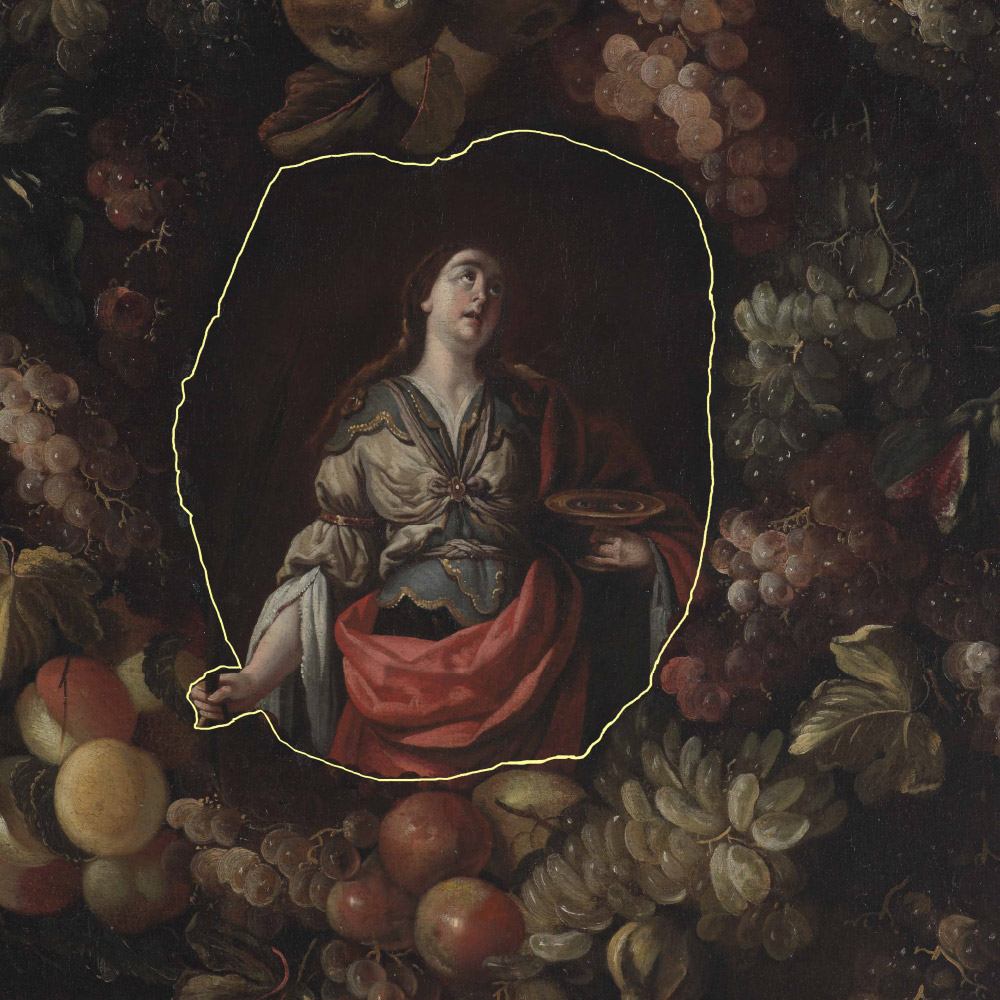 〈果實環串中的聖露西〉所描繪的就是西元四世紀羅馬時期的殉教女子-聖露西(Saint Lucy/ Santa Lucia, 283-304)。聖露西曾發願將一生忠貞獻給神,而拒絕嫁給非基督徒的指婚對象。但也因為如此被未婚夫告發是基督徒,而遭到士兵逮捕、處死。
