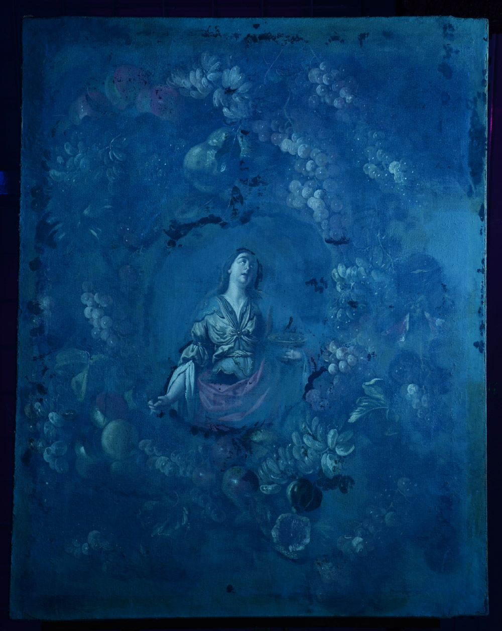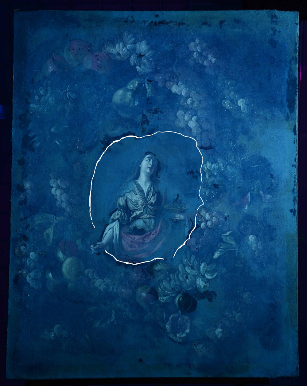 仔細觀察聖露西所在的圓圈中,其實原本還繪有聖露西的光環,背景也有一團一團的雲霧,只是為了要配合水果環串靜物畫的褐色背景,而全部被覆塗成褐色。