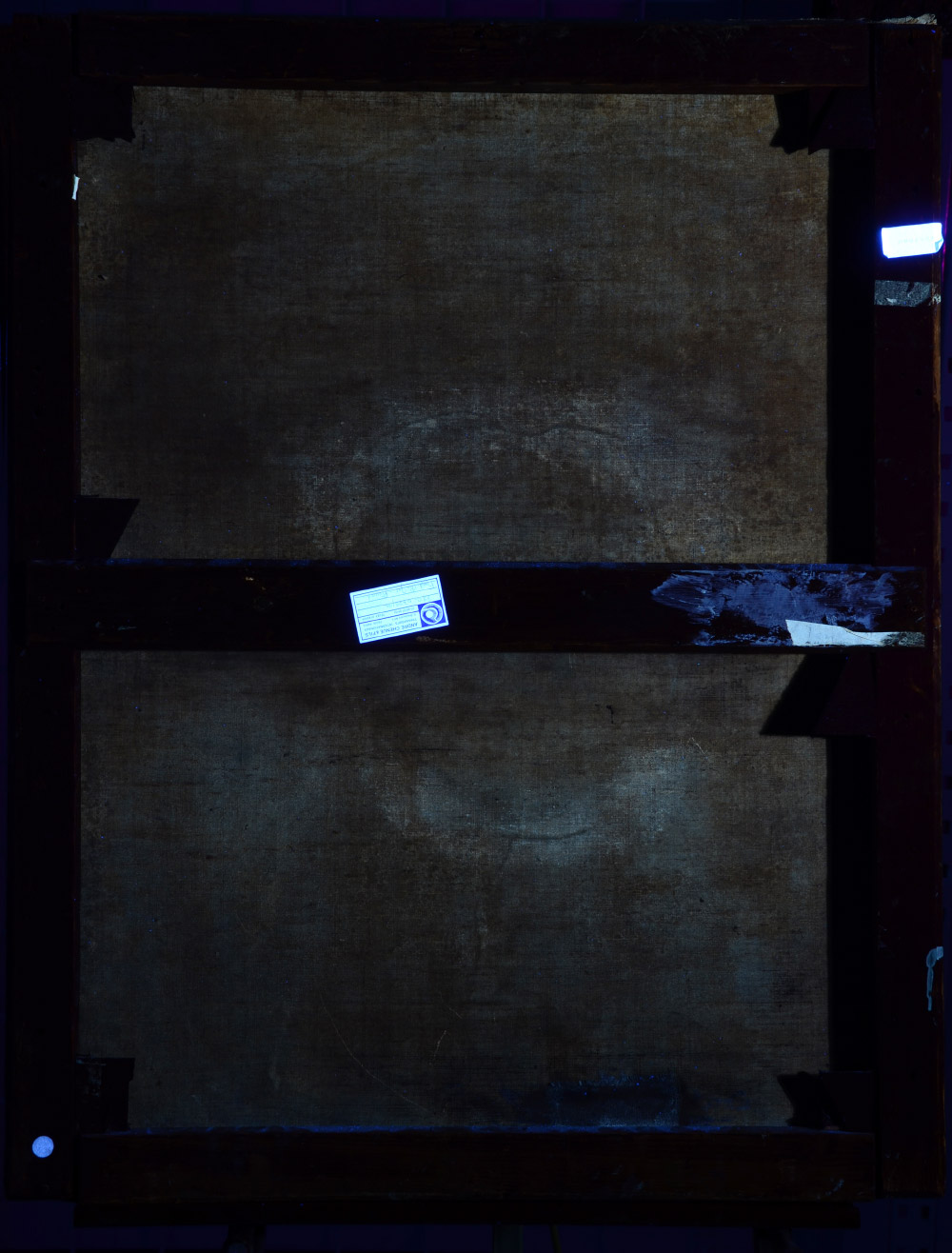翻面觀察畫作背面的畫布 ,卻發現這件畫作被做了裱襯(Lining)修復處理,意思就是畫作背面被貼上了一張新的畫布,通常是為了補強畫作結構,然而全面的裱襯也讓我們無法從背面確認這圈裂痕的深度,是只到表面顏料或是深入底層畫布?如果是畫布的斷裂痕,究竟只是原本畫布的破損造成,還是拼接畫布的痕跡?