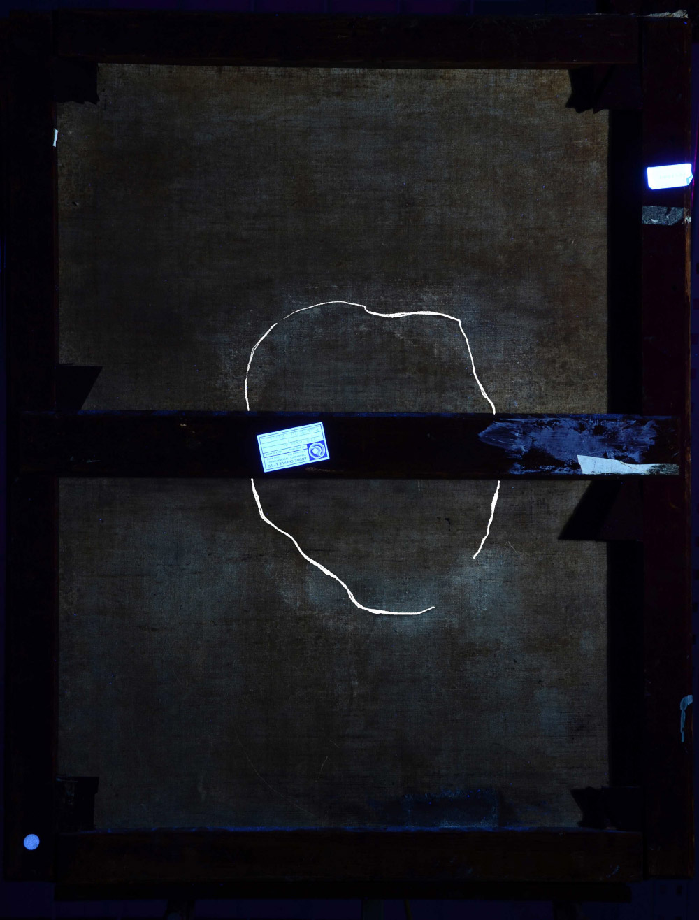 從紫外光攝影中,可以看到這條細線有許多不同層次的補筆痕跡,而且補筆還蔓延至聖露西的紅袍下,似乎是沿著聖露西形成一個圓圈。若進一步觀看作品的背布,可以看得更清楚:畫布中間有一圈膠材的螢光反應。