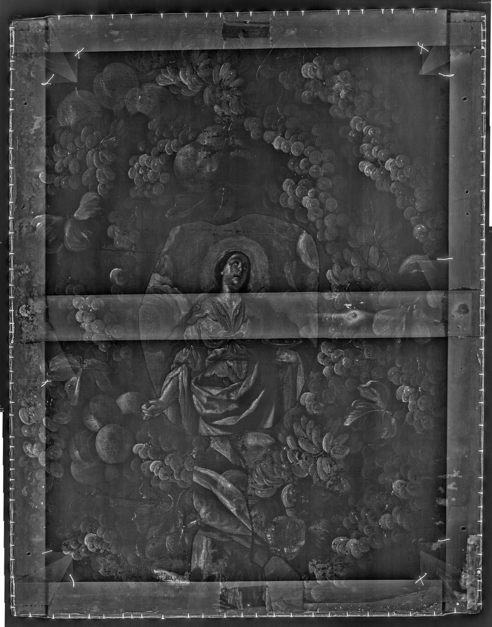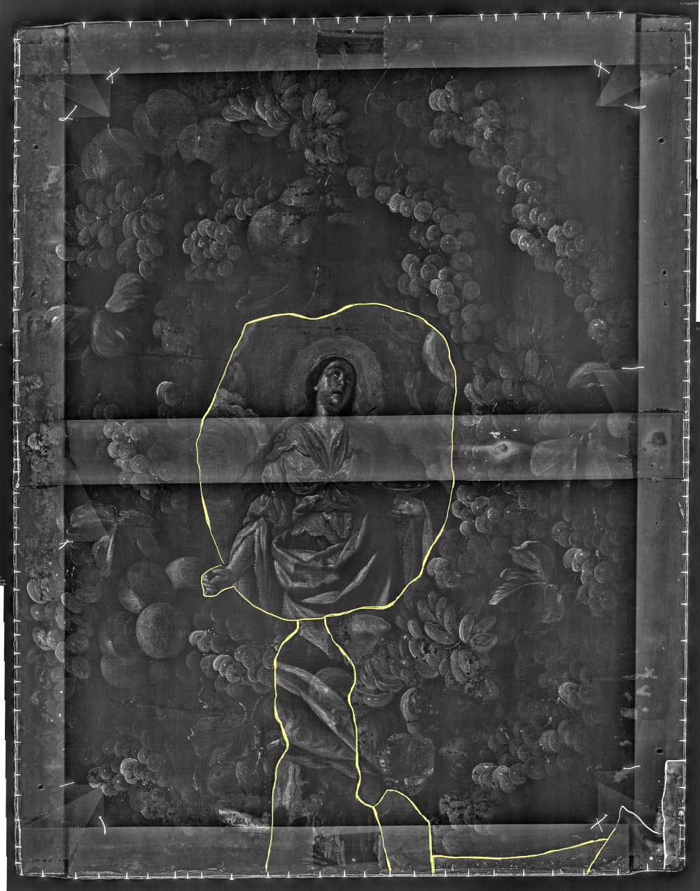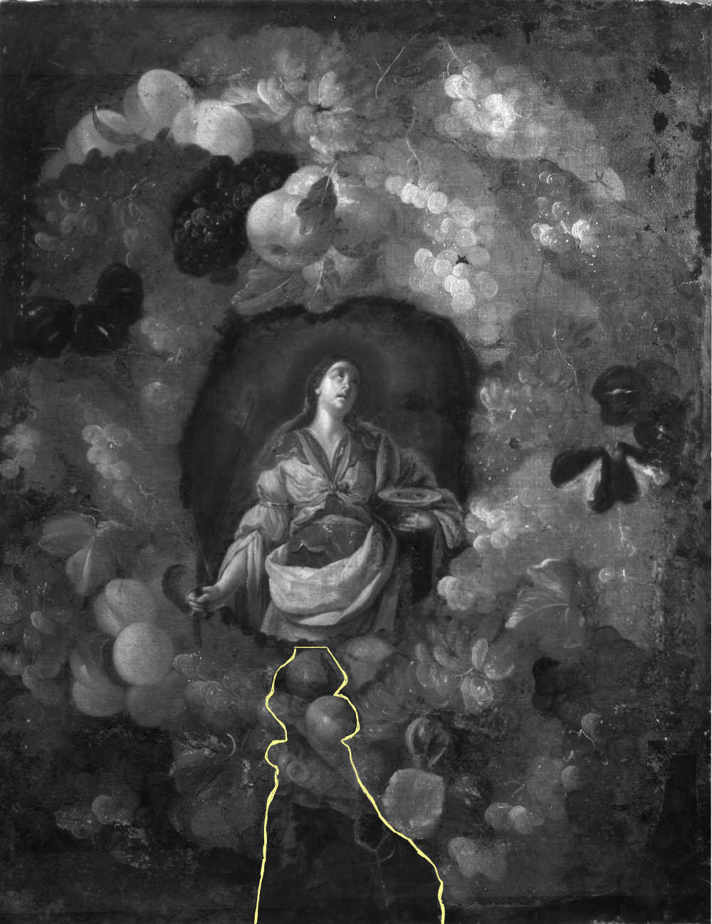 X光攝影下我們可以更加確定中央的聖露西其實是來自另一張畫,也就是說聖露西和水果環串原本是兩張不同的畫,但因為某種原因而拼接成同一張畫。