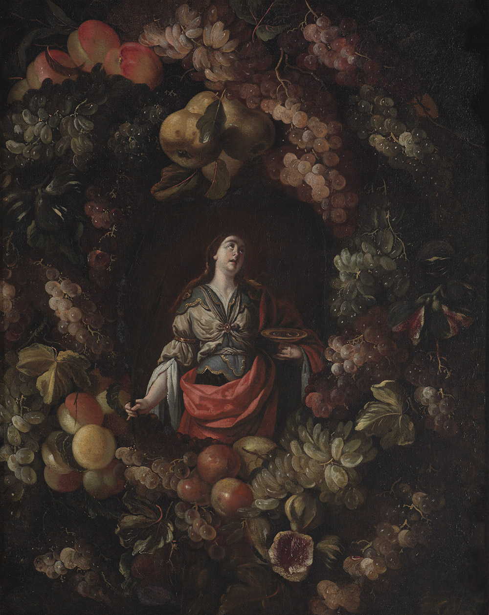 這件〈果實環串中的聖露西〉被推測可能是由西班牙畫家安東尼歐‧裴瑞達(Antonio Pereda, 1611-1678)所作。