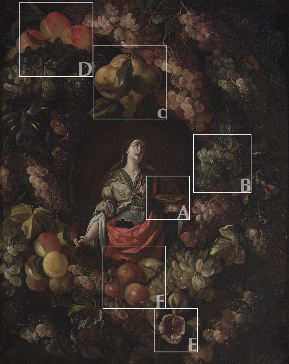 要怎麼知道這件作品可能是拼接不同畫布而來的,可以先從肉眼觀察開始!當我們仔細看著畫面時,我們可以看到聖露西周圍有一道淺淺但有些銳利的細線痕跡,隨著水果環串的輪廓而蔓延,彷彿刻意將人物與水果區分開來。再更仔細檢視,可以發現這圈細線痕跡其實是很細的凹陷,也就是顏料的斷裂痕,但是這時候我們只能隱約見到部分痕跡。