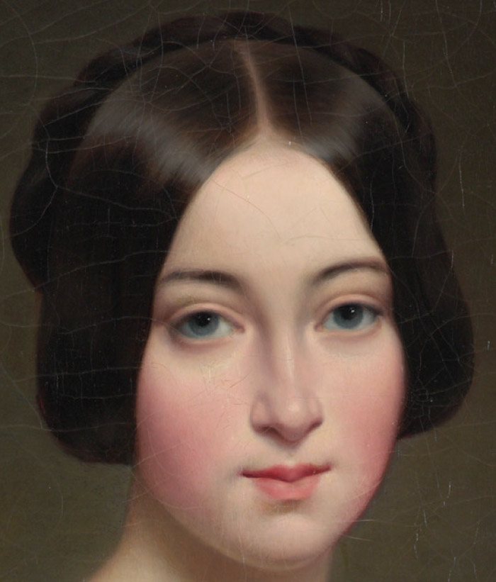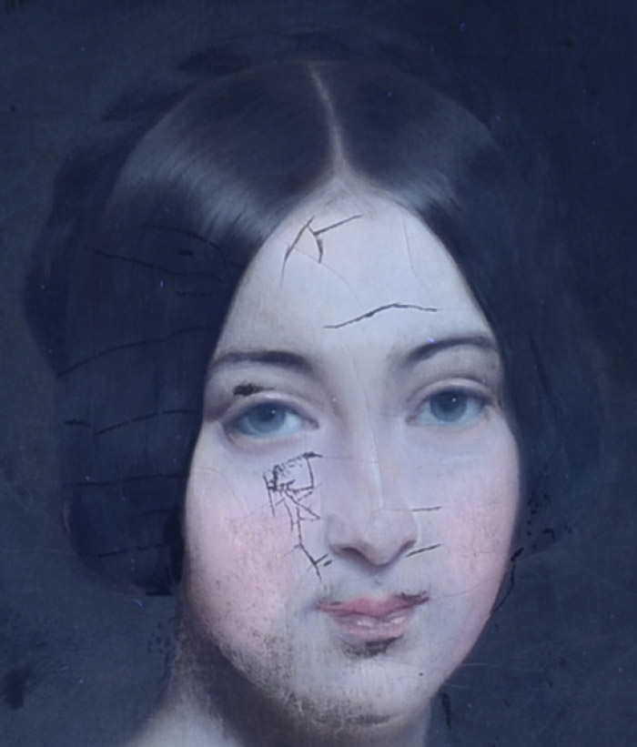 仔細觀看布蘭濟夫人,也可以看到修復師仔細填補裂紋,以降低裂紋可能會帶來的視覺干擾,讓觀眾能專心欣賞畫家雕琢人物面容的精彩筆法,而不是只注意布蘭濟夫人臉上的大裂縫!