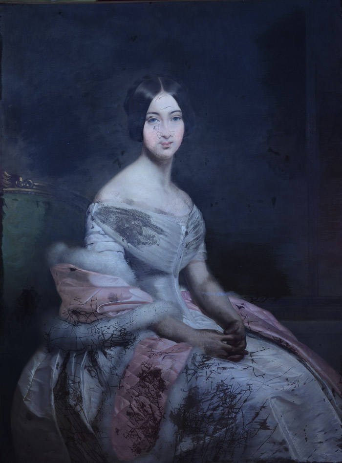 從紫外光攝影來看,〈布蘭濟夫人肖像〉其實有許多補色痕跡(紫外線攝影中呈現深色的部分),尤其是她的白色禮服。她的粉紅色披肩也同樣可見許多補色的痕跡。從這些補色的痕跡來看,許多地方都與畫作表面的裂紋一致(尤其是下擺的部分),在裂紋特別密集的區域甚至可以看到大面積覆蓋的補色修飾,例如:胸前的皺摺、下擺。雖然用補彩去覆蓋掉原本的顏料,並不是最完美的做法,但我們可以推測是原本的裂紋相當明顯,並影響到畫面整體的觀看,因此當時的修復師才會選擇運用補色以及局部的覆蓋,仔細地淡化這些裂紋所造成的視覺效果。